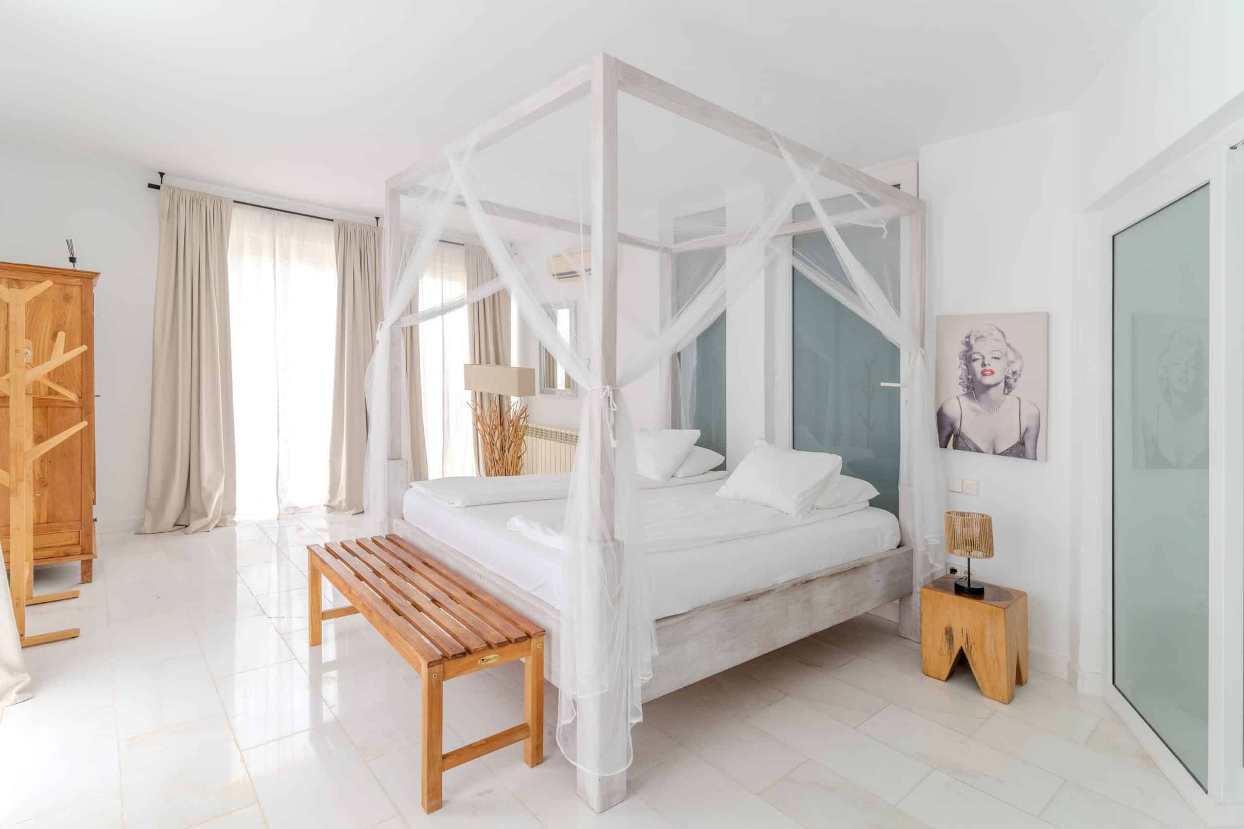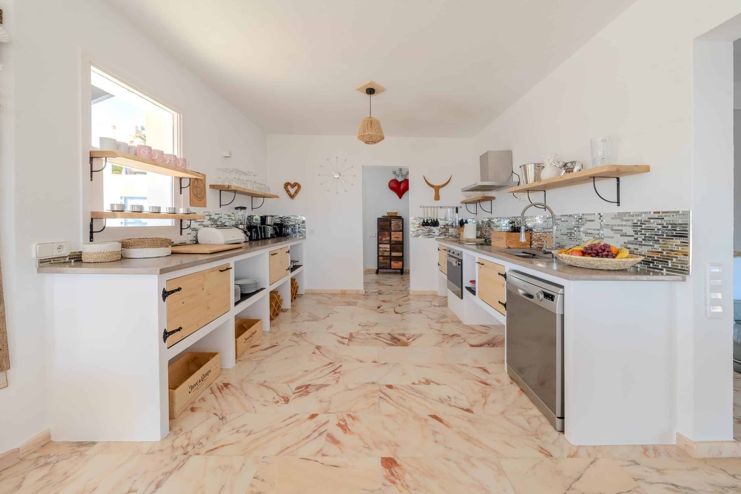 Der charakteristische rosafarbene Marmor verleiht der Villa Es Vedrà ihren unverwechselbaren Charme. Als seltenes, edles Material sorgt er nicht nur für eine außergewöhnliche Atmosphäre, sondern auch für angenehme Kühle an warmen Sommertagen. Im Inneren wie im Äußeren verbindet die Villa moderne Architektur mit authentischen, inseltypischen Elementen. Alle Räume sind klimatisiert und bieten höchsten Komfort. Ein Flachbildfernseher im Wohnzimmer sowie ein stabiles WLAN-Netzwerk erfüllen auch technisch alle Wünsche – für ein Urlaubsgefühl voller Leichtigkeit und Luxus.