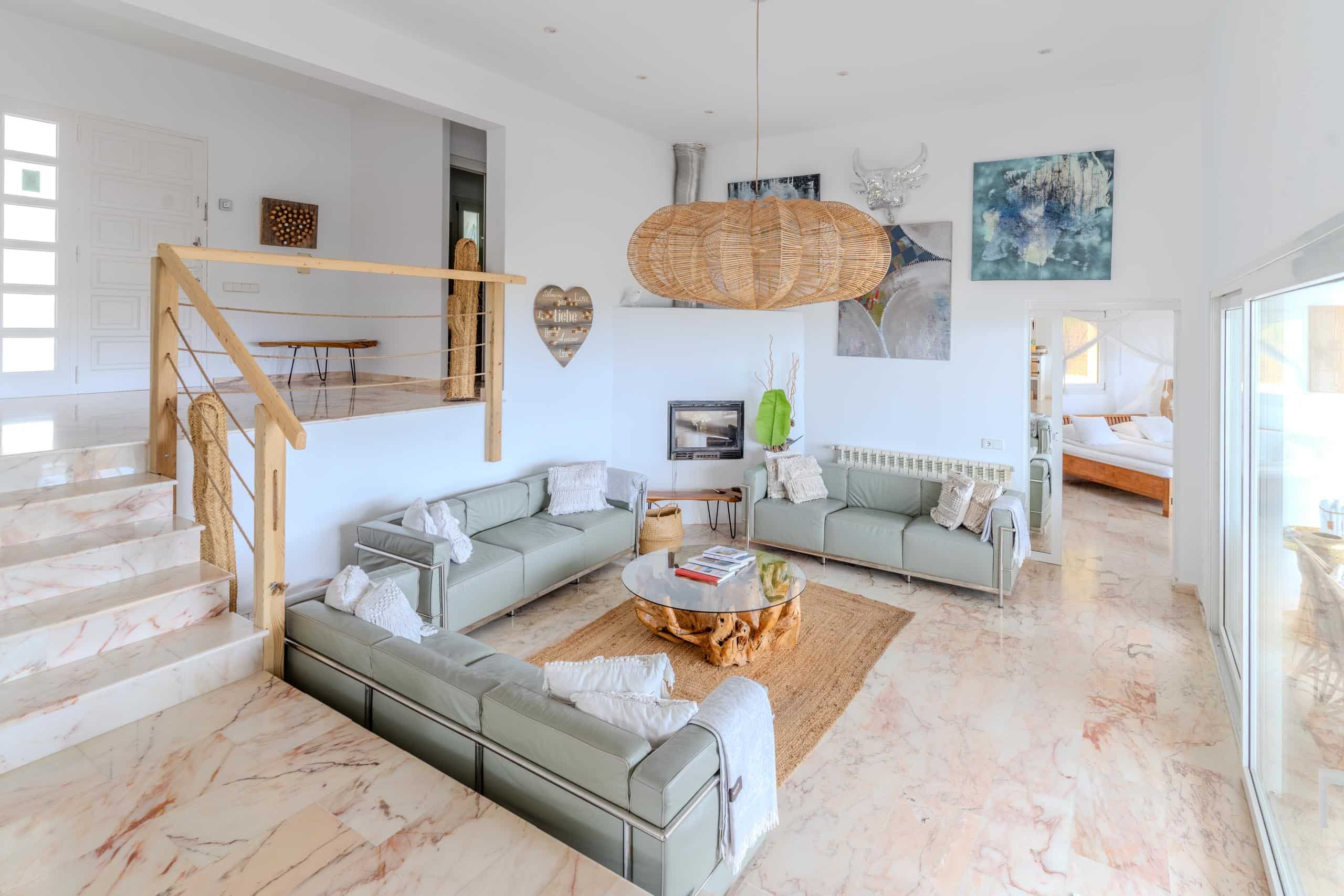 Die Villa Es Vedrà vereint klare Architektur mit mediterranem Lebensgefühl. Im oberen Bereich öffnet sich ein heller Wohnraum mit großen Fensterfronten und Meerblick bis zur mythischen Insel Es Vedrà. Eine moderne Küche mit Essbereich sowie ein elegantes Doppelschlafzimmer mit Marmorbad en suite sorgen für höchsten Komfort.