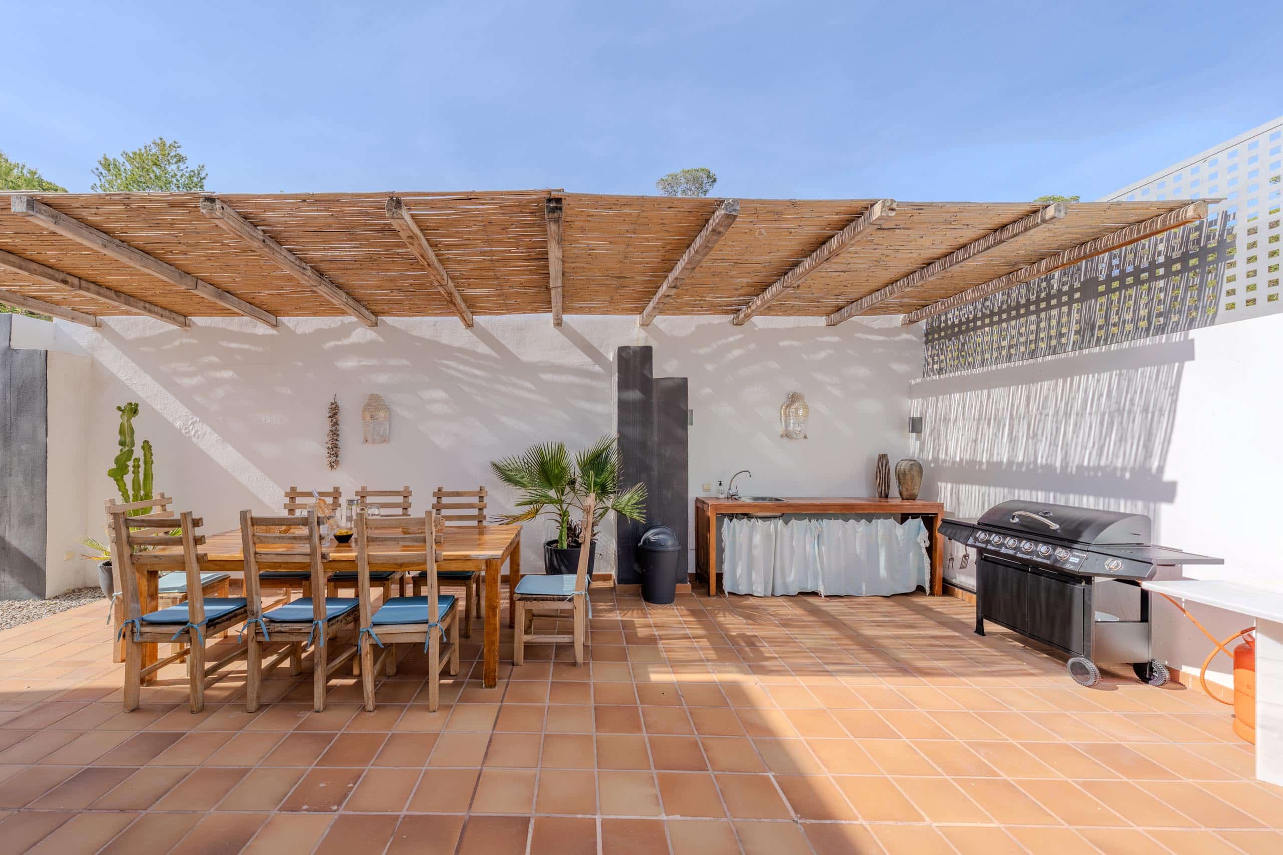 Durch große Schiebetüren gelangt Ihr auf die überdachte Terrasse mit einem großzügigen Esstisch, an dem alle Gäste Platz finden. Wenige Stufen führen hinunter zum weitläufigen Poolbereich mit neuem Salzwasser-Infinity-Pool – ein Ort purer Entspannung mit Blick auf das Meer. Das sanfte, hautfreundliche Salzwasser sorgt für ein besonders angenehmes Badegefühl und ist gleichzeitig umweltfreundlich in der Pflege. Ob beim Schwimmen, Sonnenbaden oder einem Aperitif im Schatten der Loungeecke: Die Villa Tarida ist geschaffen für das Leben im Freien.