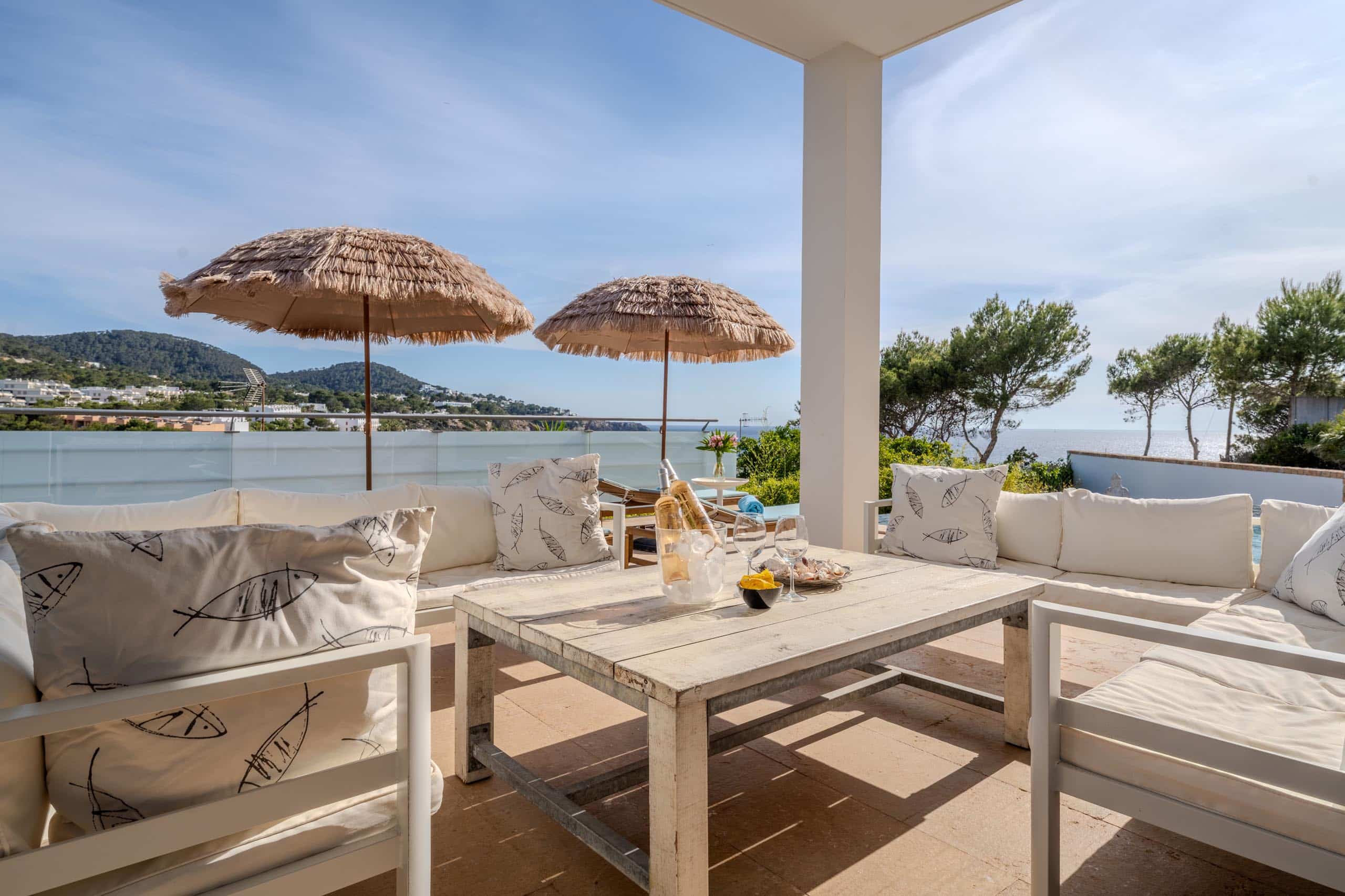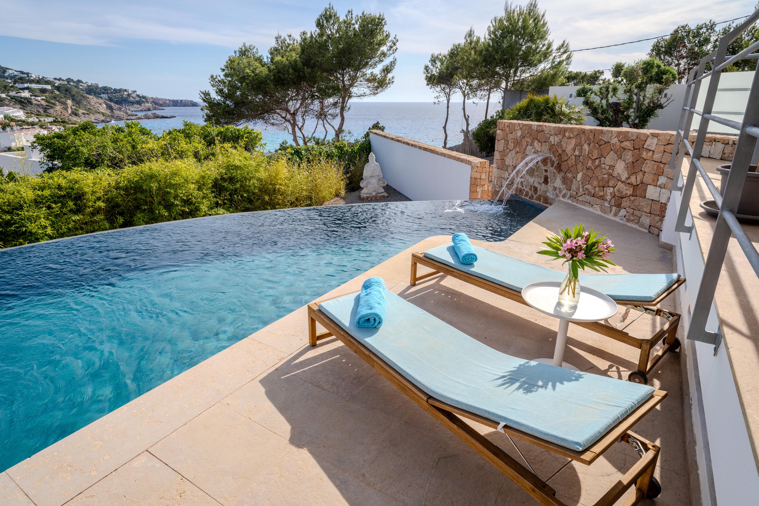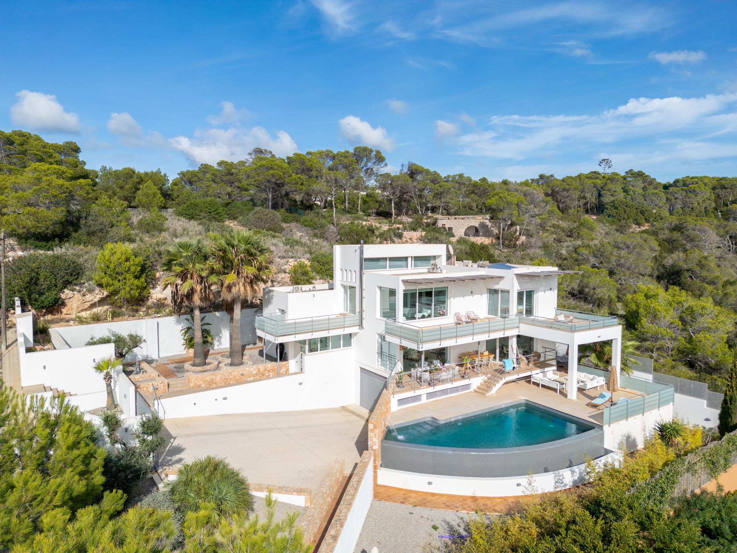 Ein architektonisches Highlight ist die gläserne Empore im Obergeschoss – ein Ort, an dem man scheinbar über dem Meer schwebt und den Blick weit über die türkisblauen Wellen schweifen lassen kann. Weitere wunderschöne Buchten wie Cala Conta oder Cala Bassa liegen ganz in der Nähe und machen die Lage dieser Villa besonders reizvoll.