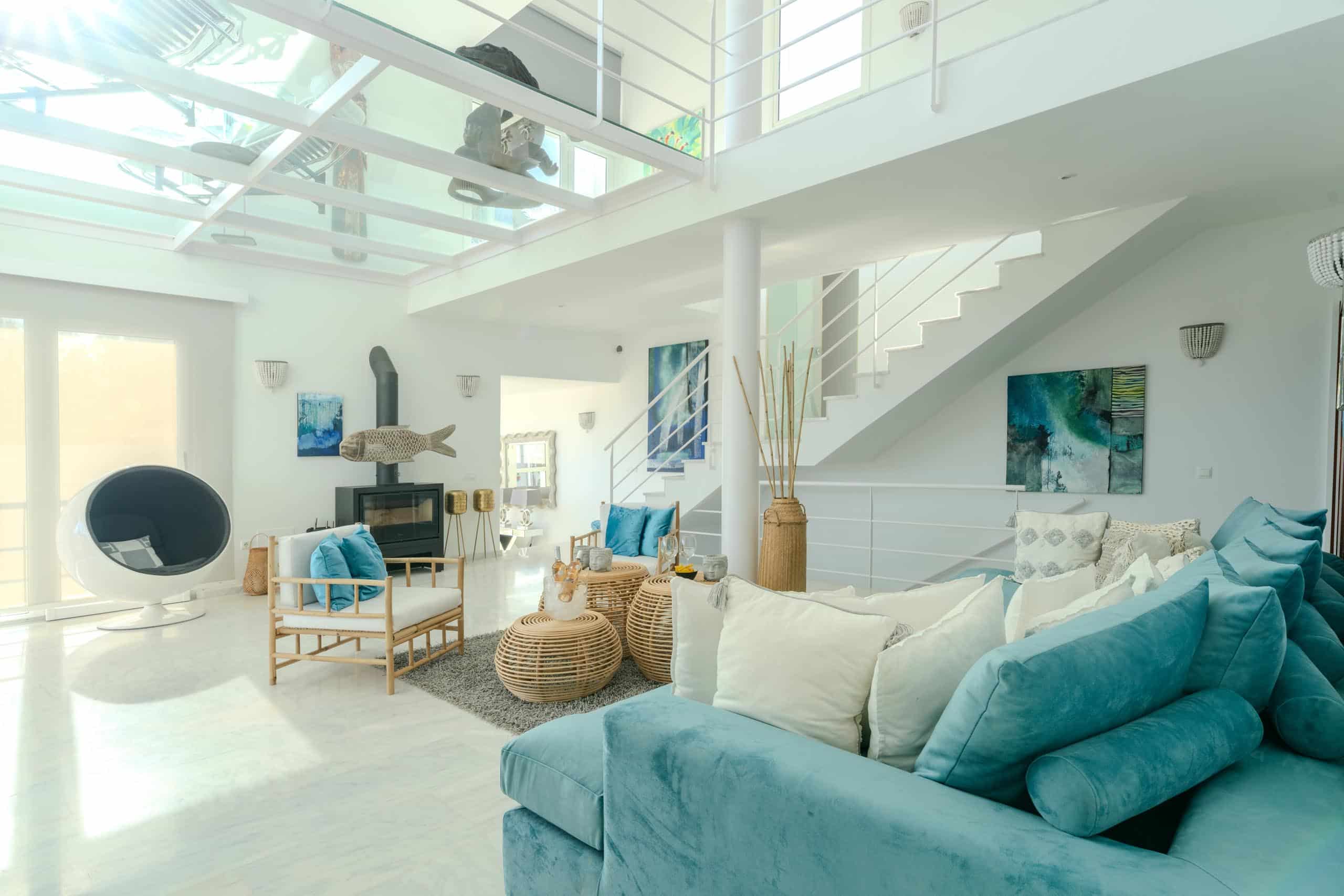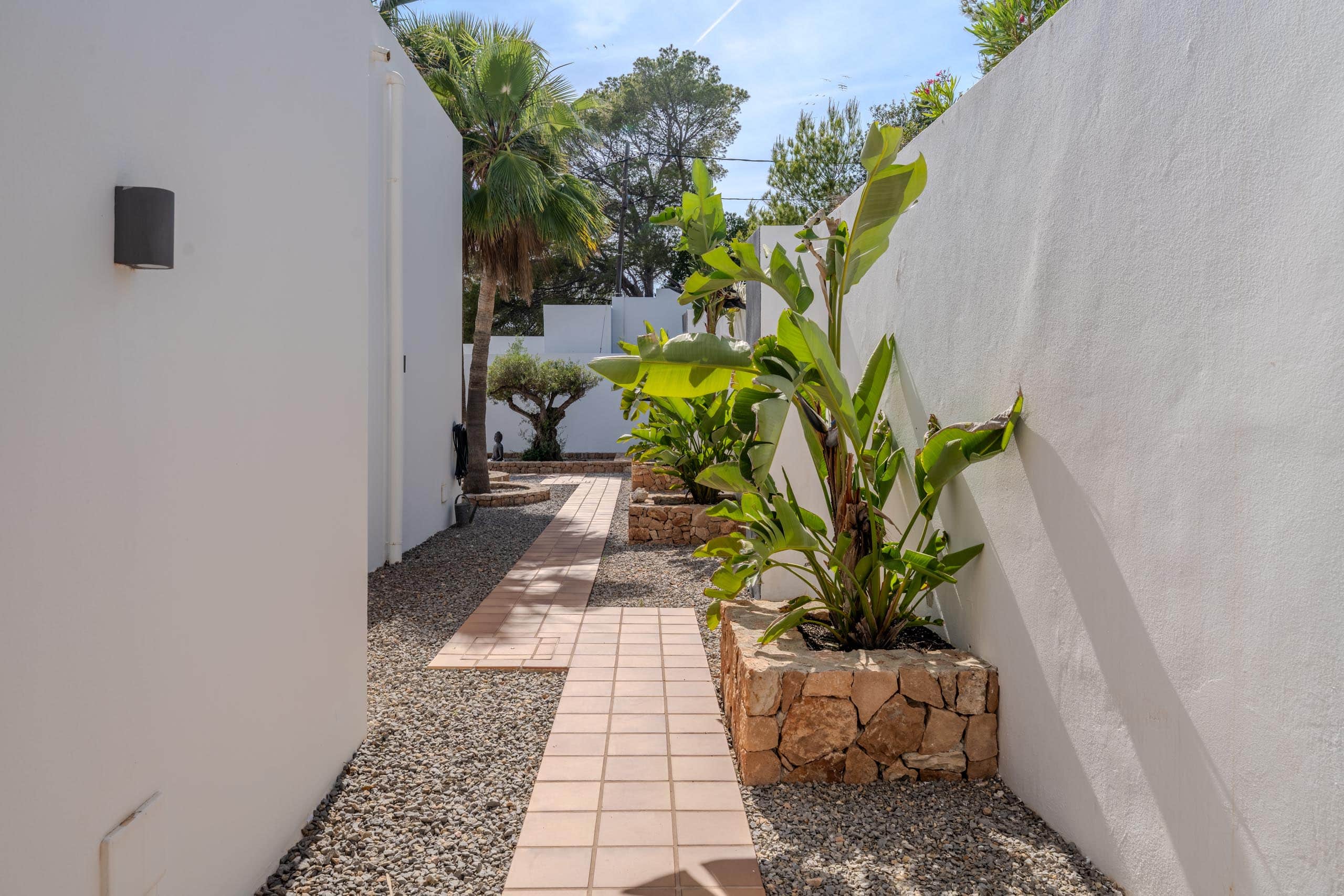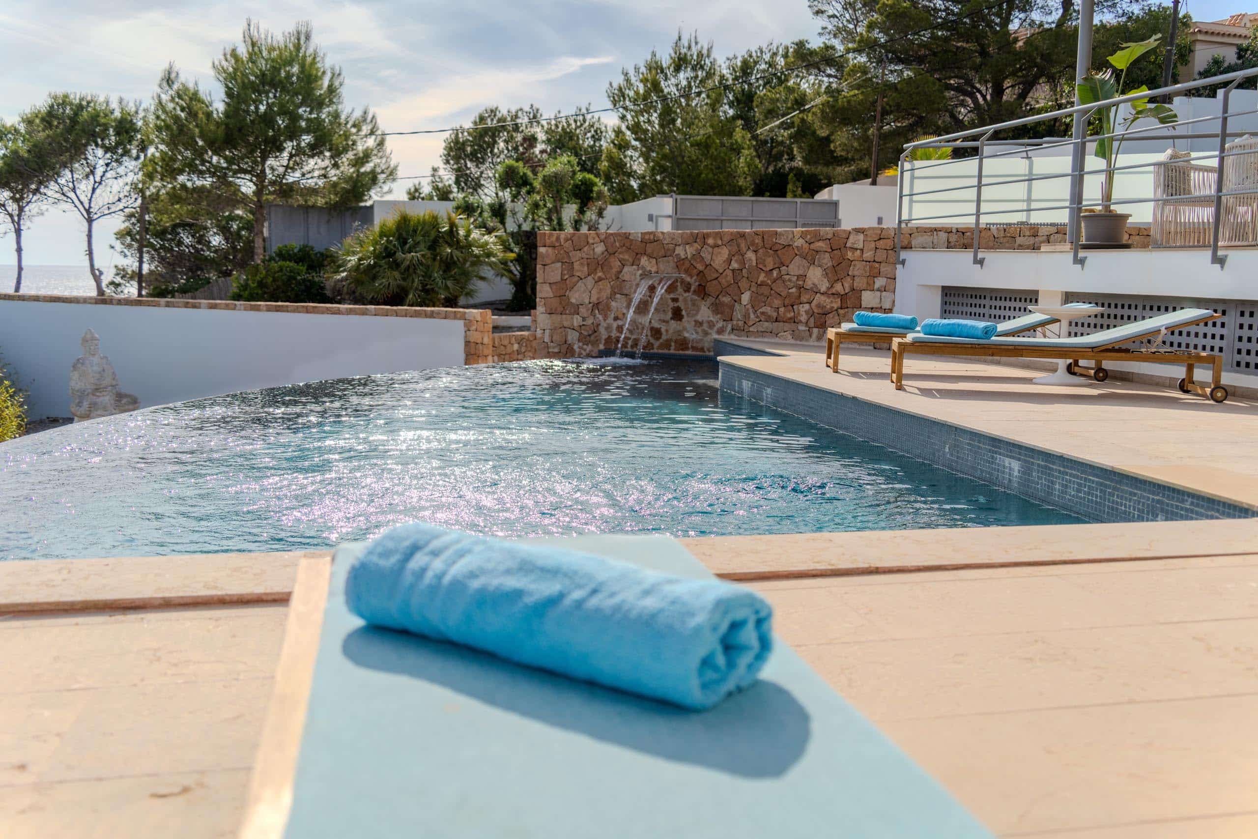 Ein architektonisches Highlight ist die gläserne Empore im Obergeschoss – ein Ort, an dem man scheinbar über dem Meer schwebt und den Blick weit über die türkisblauen Wellen schweifen lassen kann. Weitere wunderschöne Buchten wie Cala Conta oder Cala Bassa liegen ganz in der Nähe und machen die Lage dieser Villa besonders reizvoll.