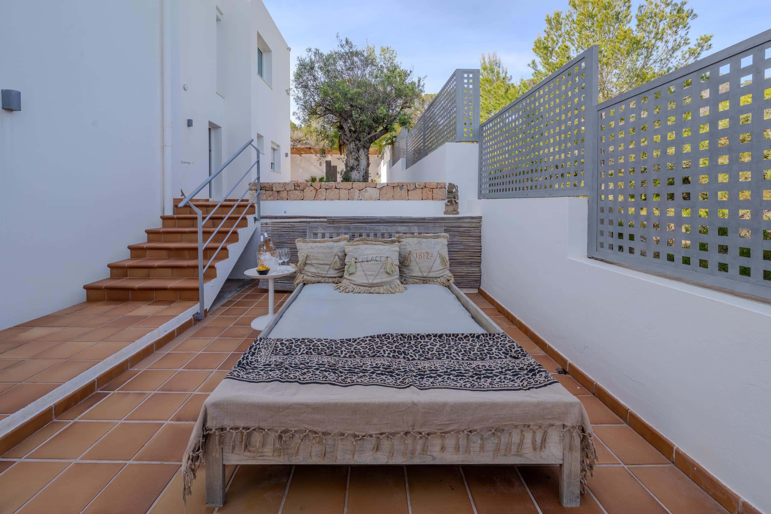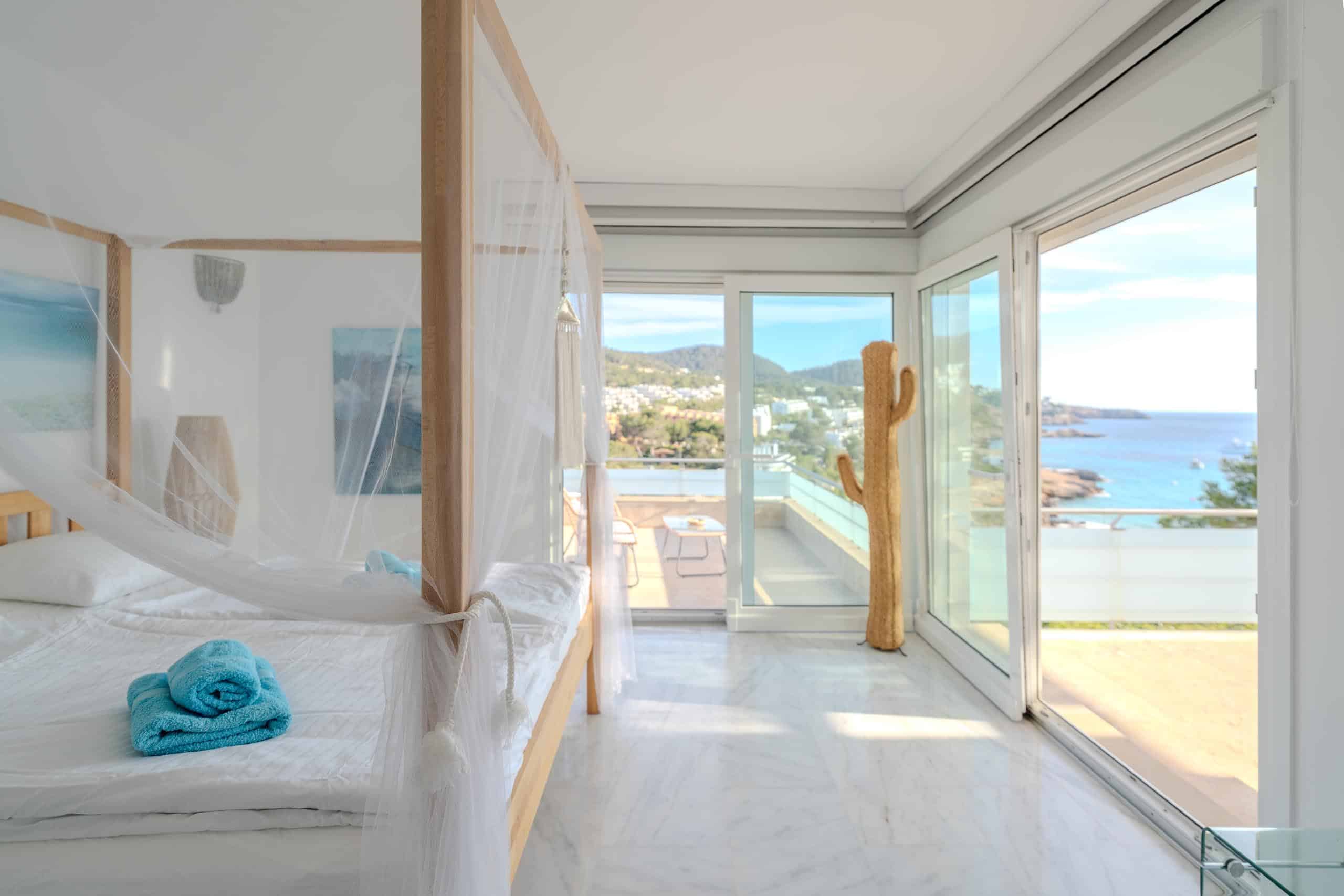 Auf den oberen Ebenen der Villa Tarida erwarten Euch weitere komfortable Doppelzimmer, alle mit eigenem Bad, Klimaanlage und großzügigen Einbauschränken ausgestattet. Das Highlight ist jedoch die Honeymoon Suite – ein luxuriöses Refugium mit großem Schlafzimmer, offenem Bad und privater Dachterrasse. Von hier aus eröffnet sich ein spektakulärer Panoramablick über das Meer und die Bucht von Cala Tarida.