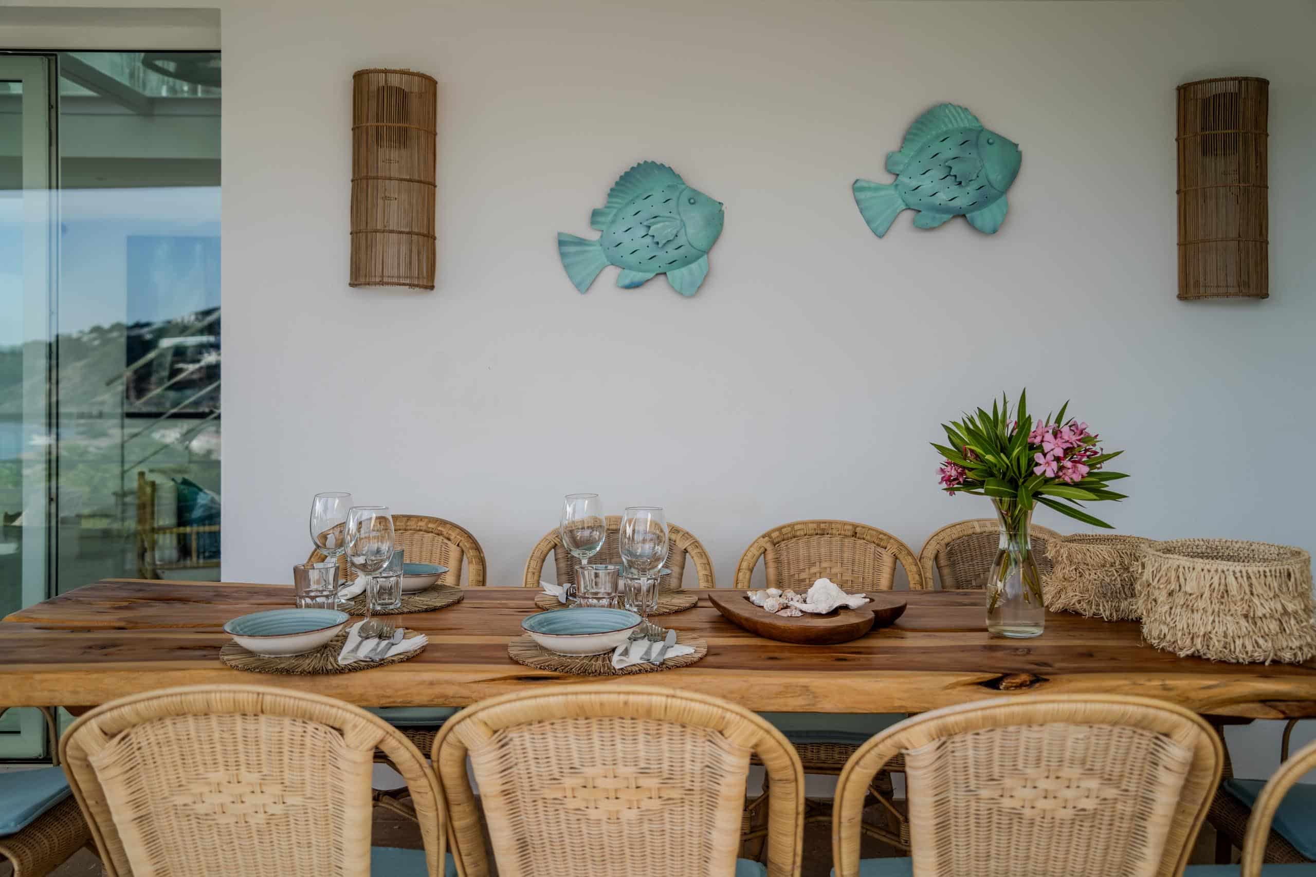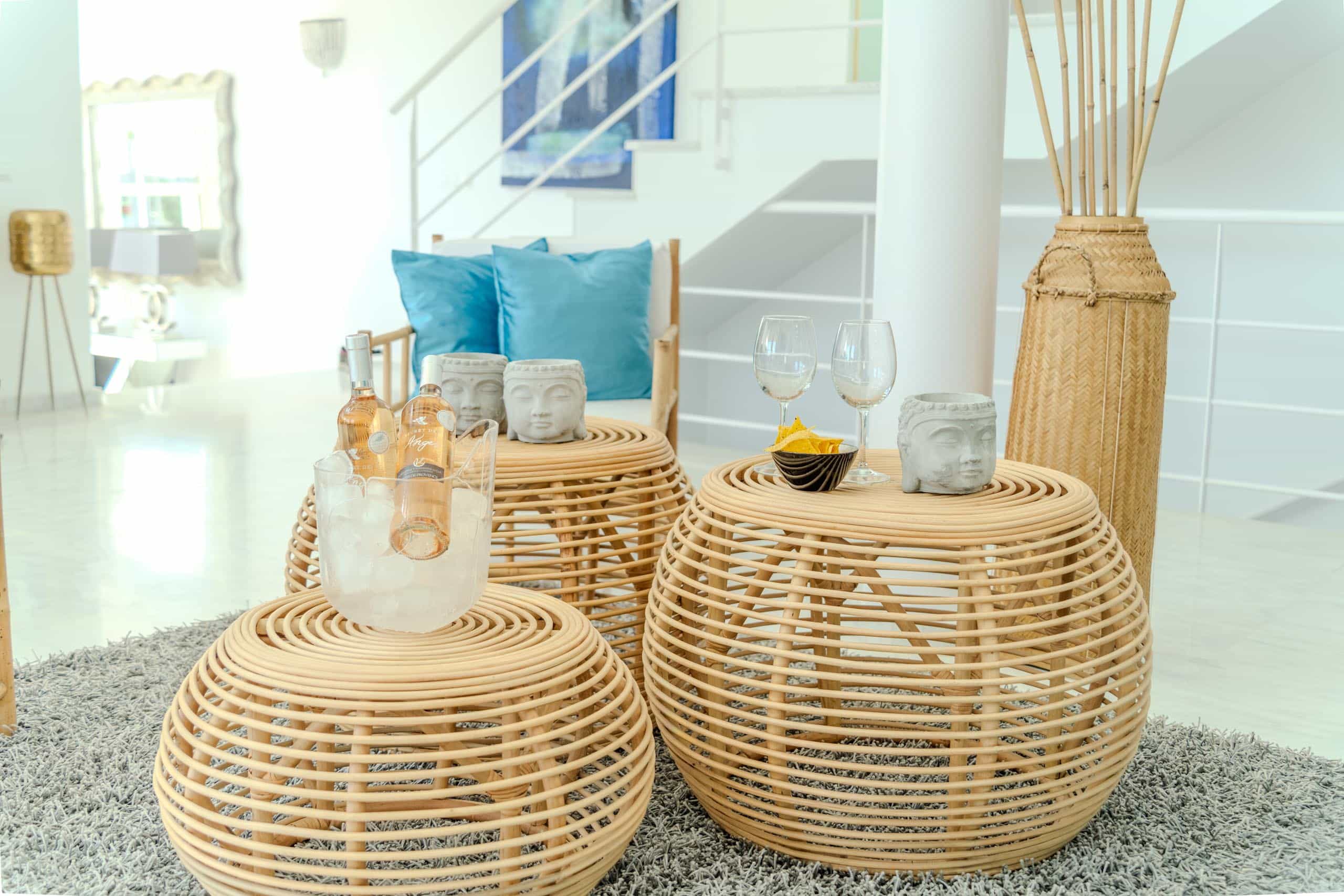 Rund um das Haus verteilen sich weitere Rückzugsorte – bequeme Sonnenliegen, Daybeds und gemütliche Sitzecken, die zum Verweilen einladen. Hier lässt sich der Tag in aller Ruhe genießen, während die Sonne langsam im Meer versinkt und die Bucht in warmes Gold taucht.